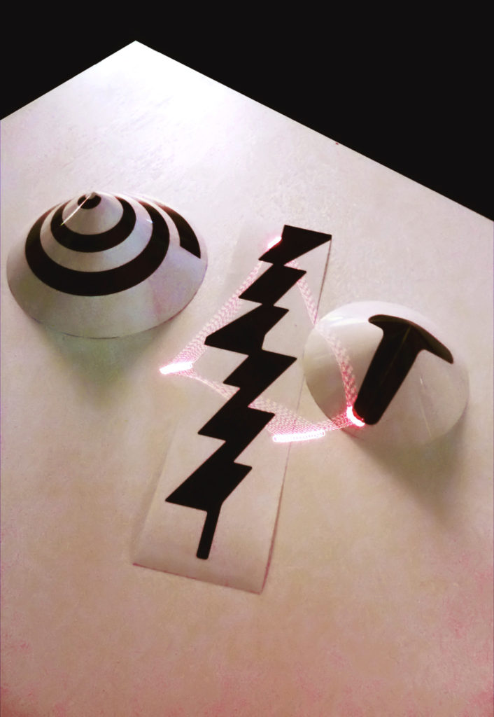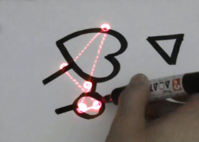 The setup can be easily configured for interaction on an horizontal surface as was done for the Sticky Light project, or a vertical surface (a wall or a large white board for people to create graffitis or draw doodles). When using the system on a table , the laser power is less than half a milliwatt – half the power of a not very powerful laser pointer. More powerful, multi-colored laser sources can be used in order to “augment” (visually and with sound) facades of buildings tens of meters away. Sound is also spatialized – panning is controlled by the relative position of the tracking spots, their speed and acceleration.