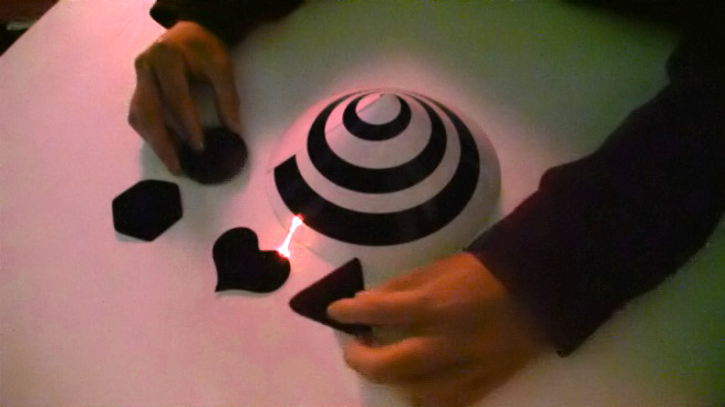 Finally, a very different mode of interactively generating sound is by manipulating the shape of the scanning saccade directly, not by using it to follow a contour. This creates a very different experience – the laser shape looks organic, amoeba like, crawling over the drawings or crying when compressed.